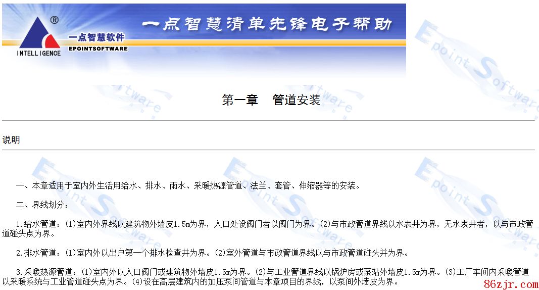 问一下,这个界限划分在那里可以找到?对量的时候得有理有据啊。 (1.给水管道: (1)室内外界线以建筑物外墙皮1.5m为界,入口处设阀门者以阀门为界。 (2)与市政管道界线以水表井为界,无水表井者,以与市政管道碰头点为界。) 就这个在哪本书里找得到?你好 ,界限划分在给排水