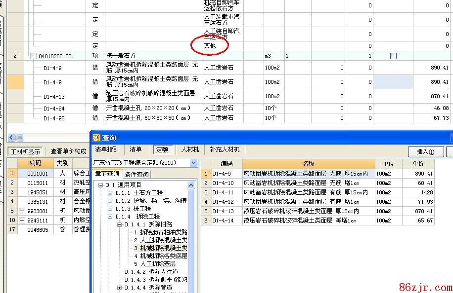 你如果说的是砼路面的凿除,然后安置路灯,那么对应砼的凿除是没有对应的清单项的,可以说是可以任意的选择清单项,包括列在路灯安置的清单里也是可以的,每个清单项的“其它”就是可以编辑任何的定额了,图片供你参考选择相应的定额子目。