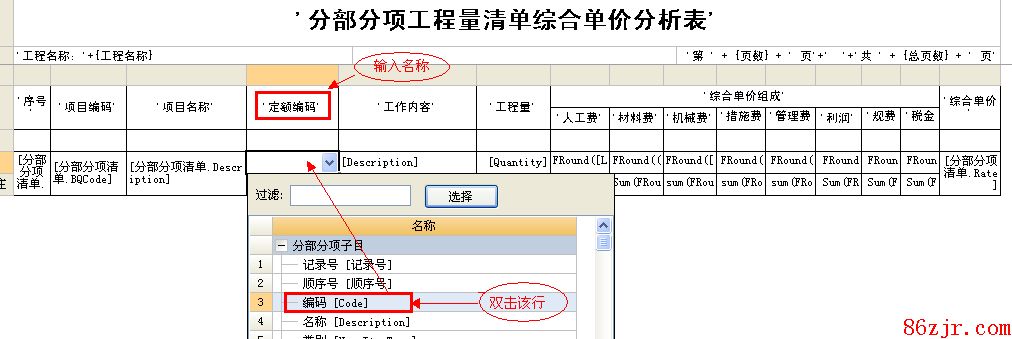 报表中,打开原有全用度综合单价表——点东西栏中“高级设计”;见图1——出现表格编辑窗口,原表格“工程内容”前插入一列,输入名称——点内容行出现小三角——窗口“分局部项子目”下——双击“编码”——退出设计——留存报表;见图2。