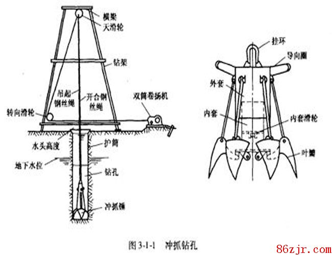 照片依次为:进攻钻机、回旋钻机、锤击钻机(柴油打桩机)、冲抓钻机。图纸里边指示说“钻孔灌注桩”,没说怎么钻孔,哪种工艺不可,一定要让设计单位明确施工工艺,施工单位不克包袱施工工艺的责任。