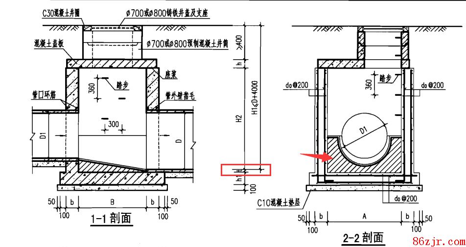 06MS201-3排水检查井中检查井的流槽高度=管道中心标高-井底标高确定,还有图中的t是指管道的壁厚。