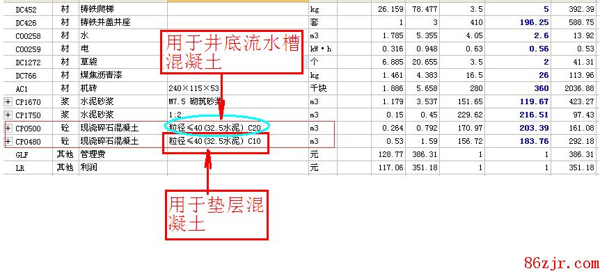 定额中Φ1000的砖砌圆形雨水检查井,材料表中只有C10的垫层混凝土,我看图集也有流水槽,为什么没有这部分混凝土?