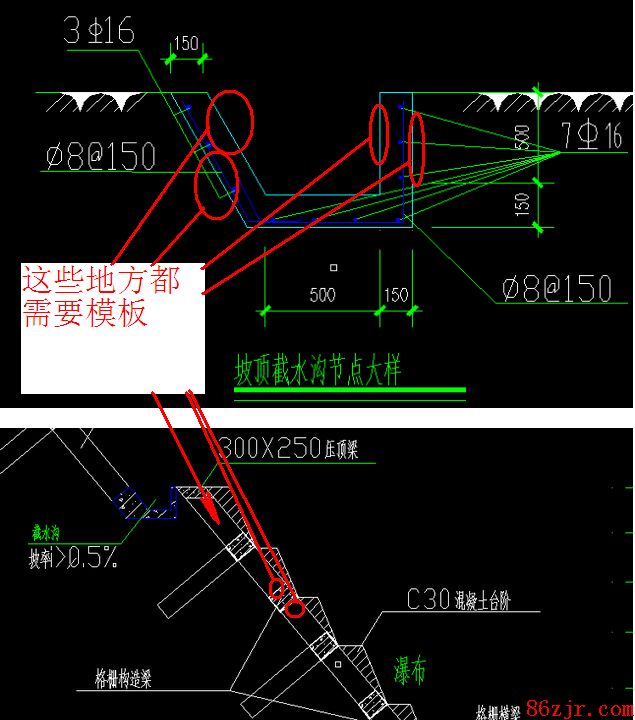一、整体同时施工;二、右边沟墙的垂直立面;三、现浇才能起到护坡的作用,模板要计算;四、模板计算梁的两边侧边。