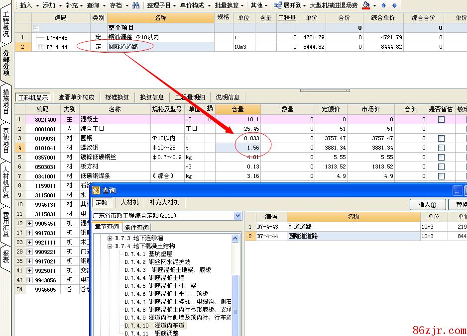 “隧道章节里,钢筋制循分成几种,一种是梁板柱墙的钢筋制安,还有一种是钢筋调解,请问钢筋调解应该在什么时候使用呢?”当所套用子目中含有钢筋(如图片中的子目),而子目的钢筋量与设计的要求存在有差距时,就要用钢筋调解子目进行调解。