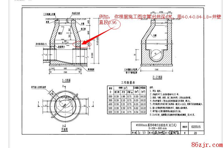 1、05S515图集里面 检查井的尺寸井筒》400 井段》840 这表示检查井变径高度不能小于840的意思,是最小尺寸。