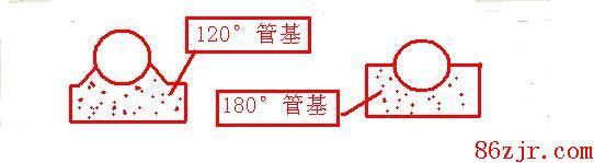 180°管基管道半径范围内(1/2管道周长)全部被管基包裹。120°管基1/3管道周长被管基包裹。