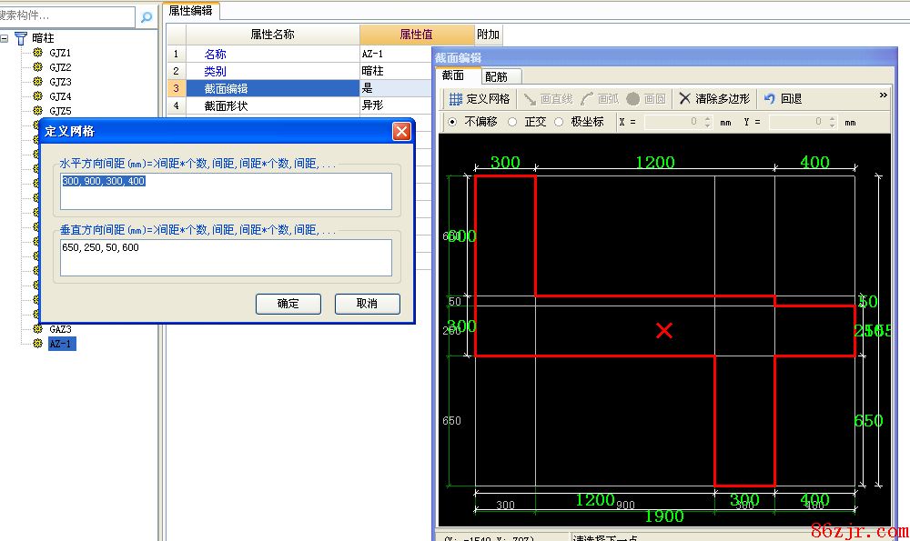 你好:这样的暗柱软件里自己界说一下网格,请看我帮你界说的图。