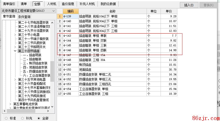 图中二三级插座均套用暗装单项双联插座安置子目,三级及三级带开关插座均套用插座暗装 单相 单联子目。主材价格按实际计入即可。如图