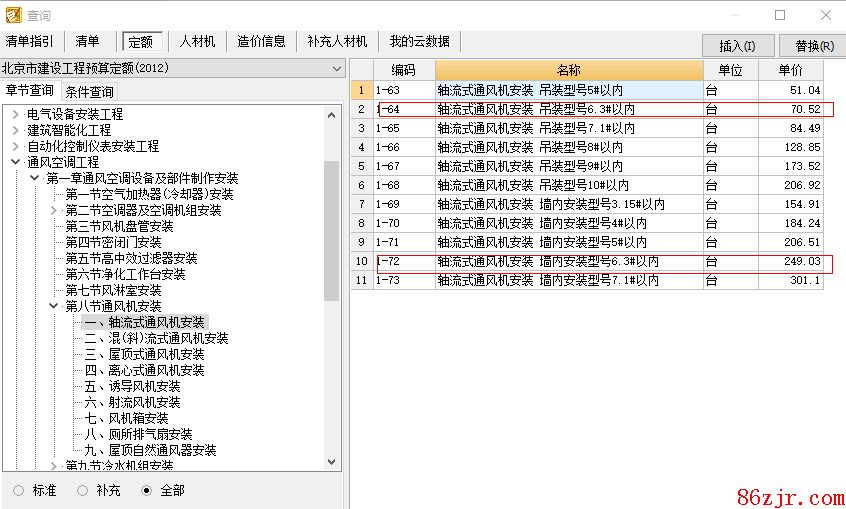 送风风机 HTF-1-NO6.3 Q=187003/h P=510pa N=1450r/min是轴流风机套用北京12通风空调工程中的轴流式通风机安置 子目,按安置形式选择套用图中的一个子目,设备价格按实际记取。如图