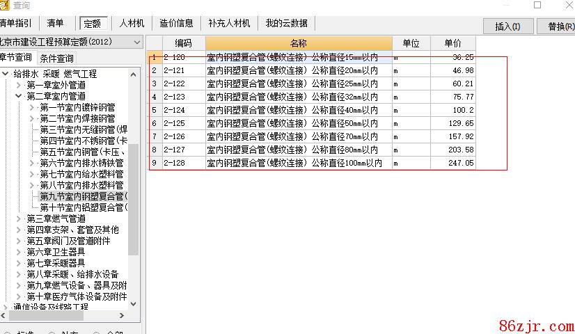 1.套用室内钢塑复合管(螺纹连接) 子目. 按冷热水管分别更改主材