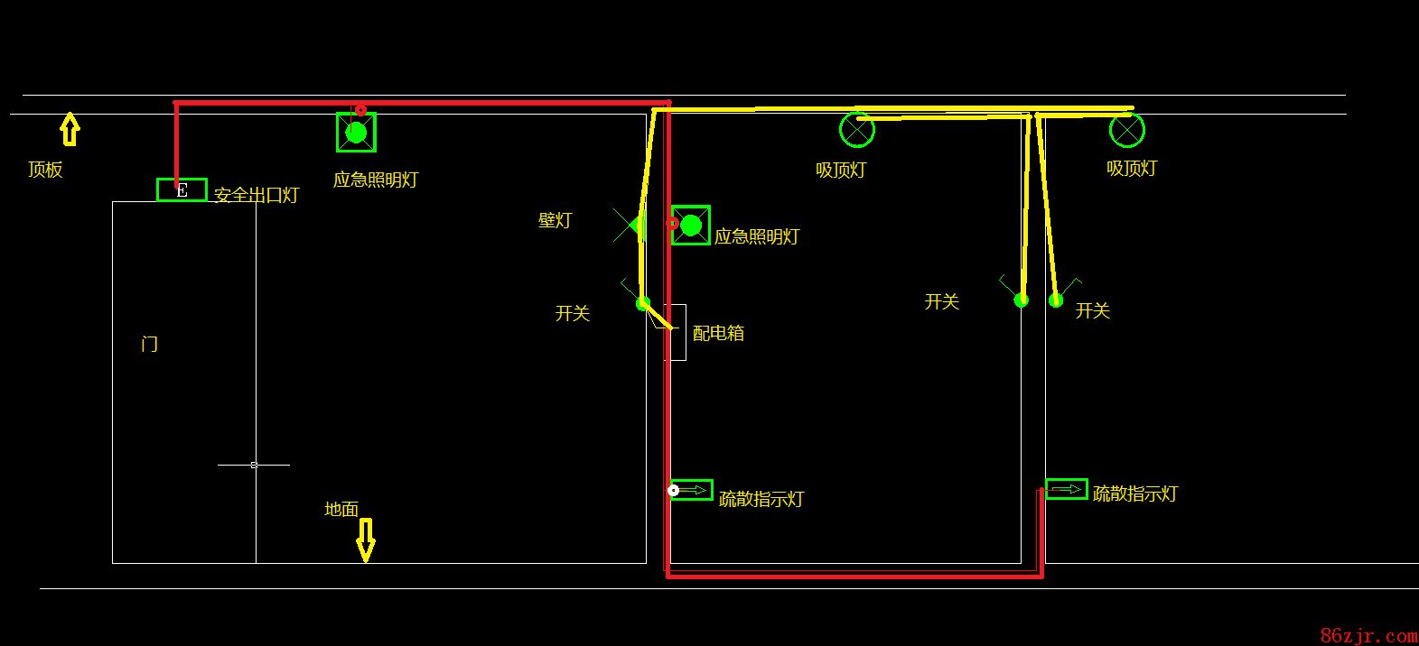照明配管遇到开关时就可以直接干线引下支线;这是安置在顶棚上的灯具。如果安置在墙壁上的灯具,也需要像插座一样上返或下返的。如疏散指示灯、安定出口灯、安置在墙壁上的应急照明灯、壁灯。
