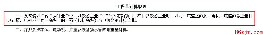 电机和水泵有非直联的,分体的要离开计水泵(含底座)和电机重量。如果一个直联泵7吨。。。。还有一个非直联泵 水泵7吨 电机7吨。。。。。他们都套一样重量水泵的定额这样合理。定额是综合考虑的。
