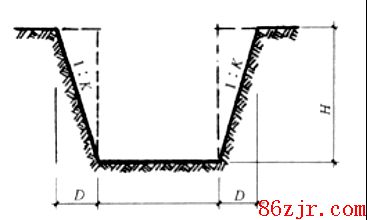 如图所示,H是挖土深度,当土质为一、二类土,H≥1.2m时,要放坡,人工挖土放坡系数为0.5;同理,土质为三类土,H≥1.5m时,要放坡,人工挖土放坡系数为0.33;土质为四类土,H≥2.0m时,要放坡,人工挖土放坡系数为0.25。