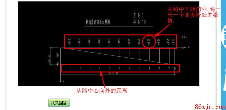 这个图,从中心位置开始,向路外侧偏向,长度1米时,对应的上方标出了相对中心点位置标高降低了一定的数值,每向外一米一个数值,最右侧标出了最外侧11.5米位置的最大的降低的高度.