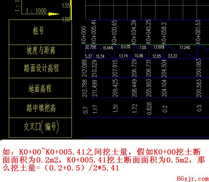 如果图纸没有 挖填面积,那么凭据设计挖土深度×路基挖土宽度计算。如K0+00处挖土深度为0.7m
