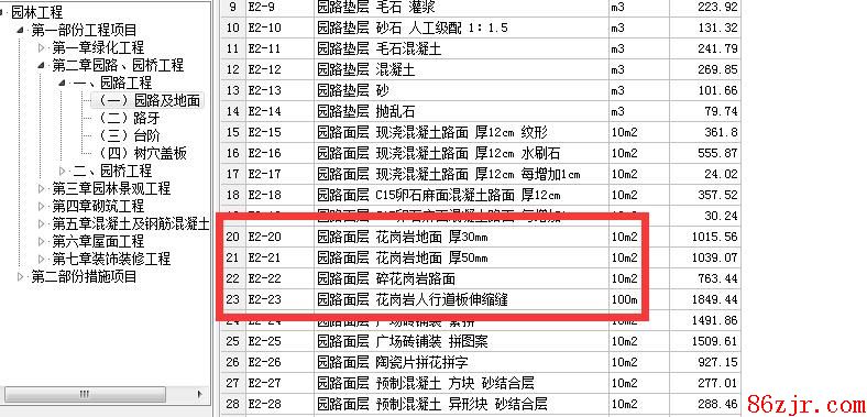路面厚度、宽度、材料种类:黄锈石花岗岩荔枝面300*300*30 45°铺设 安徽2005园林定额园路里面没有花岗岩路面这一子目,2005市政定额里面有人行道花岗岩路面子目,可以借用吗?