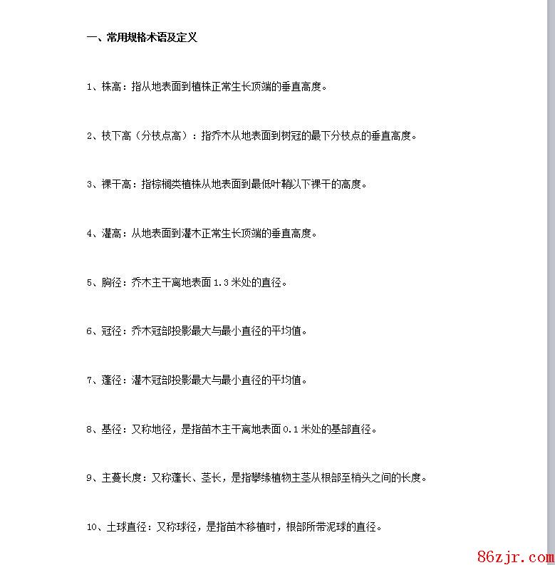 H:高度(株高、灌高、裸干高)常用“H”体现,好比“H200”一般体现苗木高度为200厘米;Φ:胸径常用“Φ”体现,好比“Φ5~6”一般体现苗木胸径为5~6厘米;P:冠幅(冠径、蓬径)常用“P”(也有用“W”)体现,好比“P200一般体现苗木冠幅为200厘米; 建筑问答网永远以提供国内外最新、最好、最快的造价专业资讯为目标D:地径一般用“D”体现,好比“D5-6”一般体现苗木地径为5-6厘米;L:主蔓长度常用“L”体现。