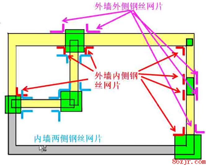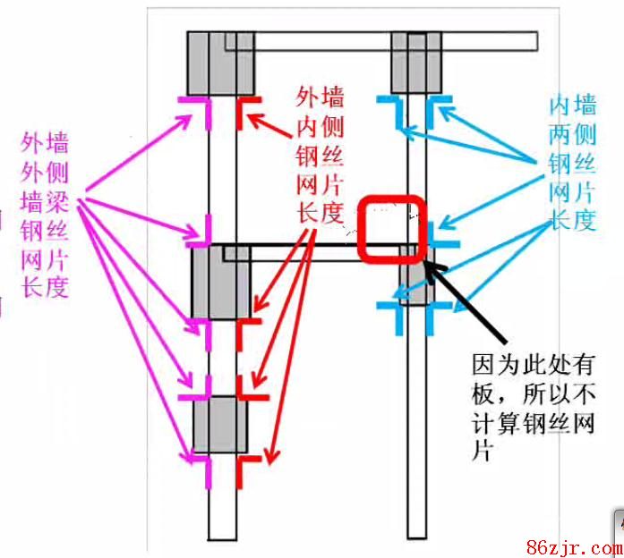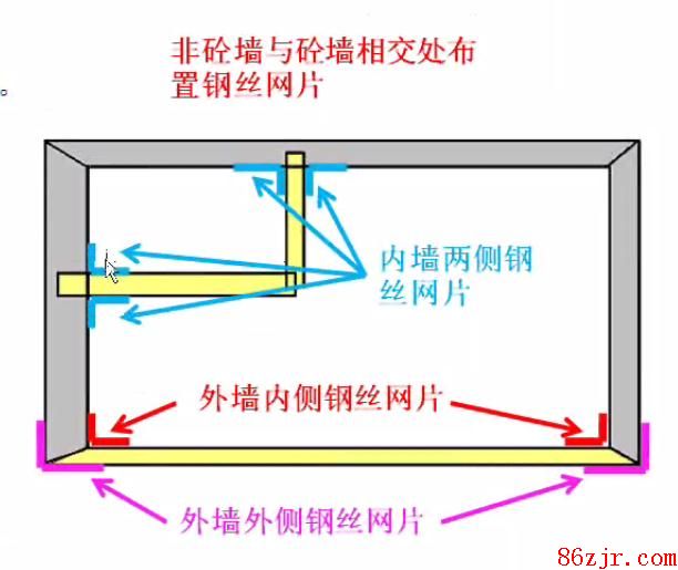 新手勿怪哈。查资料写的砌块墙在内墙位置时,砌块墙和砼梁相交,墙面两侧各设置一道钢丝网片,长度为墙的净长。 图纸上总说明里有句话,……交界处铺12.7*12.7*0.8热镀锌钢丝网,周围向外延伸300. 意思是竖直缝的时候,网片长为层高-梁高,还是层高-梁高+0.3?