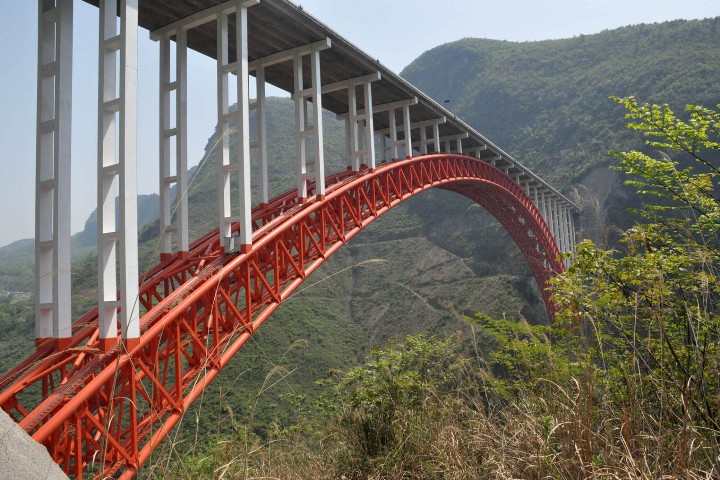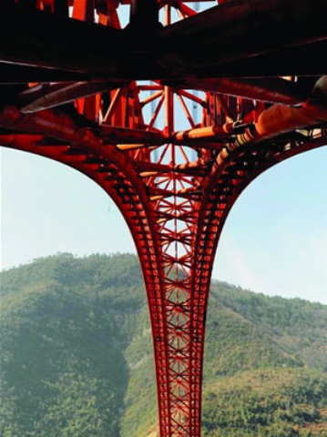 跨径430米的上承式钢管混凝土拱桥,为世界同类桥梁跨度之首。支井河特大桥是沪蓉西高速公路湖北恩施至野三关段的“咽喉”工程,全长545.54米,计算跨径430米,桥身由30个节段钢管拱肋顺利安置合龙、8根主弦管混凝土一次顶升灌注乐成、拱上立柱平稳安置和168片箱梁圆满架设完成,接纳“先栓后焊、栓焊结合”的连接方法在国内首次解决大跨度钢管拱肋运输和拼装难题,使受力更为合理。大桥的建设克服了无水运条件、无整节段陆运条件、无法接纳传统工艺钢管拱肋安置和无法安置缆索起重机等纷乱山区条件下,修建大跨度桥梁的设计施工难题,开创了国内外先例。现已建成通车。