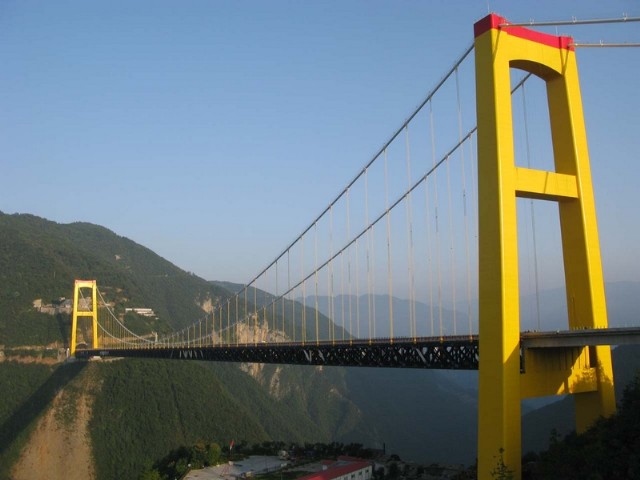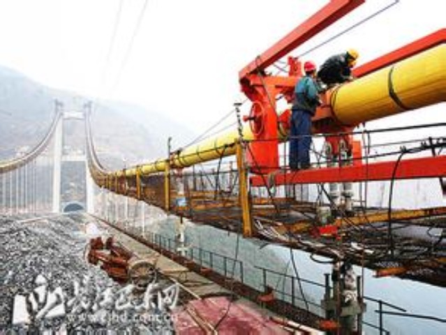 跨度900米的单向坡悬索桥,在世界同类桥梁中排名第一。四渡河特大桥位于湖北省巴东县野三关镇,全长1365米,主桥为单跨900米的双铰钢桁架加劲梁悬索桥,从塔顶至峡谷底高差达650米,被誉为世界第一高桥。该桥是沪蓉西高速路上自然环境最为艰险、施工难度最大、科技含量最高的大桥,属关键控制性工程。桥区地形起伏巨大,施工园地狭小、运输条件困难,具有如下特点:桥梁跨越四渡河峡谷,桥面行车道与峡谷谷底高差达560m,比目前世界最高桥法国米约大桥还要高290米,被誉为世界第一高悬索桥;宜昌岸隧道式锚碇单缆拉力2万吨,为我国在建的最大规模的悬索桥隧道式锚碇之一,隧道锚位于分叉式公路隧道上方,与公路隧道的最小距离23米,相互影响纷乱,国内外尚无先例;主缆跨中设置刚性中央扣,为国内首次接纳,与通例设置纵向阻尼器相比,既有效提高了桥梁纵向刚度及抗风稳定性、改进了结构受力特性,又减少了后期维护劳动量;接纳创新可调换式锚碇锚固系统;钢-混凝土组合结构桥面系国内首创;借助火箭弹发射先导索过峡谷,开创了国内乃至世界建桥史上的先河。