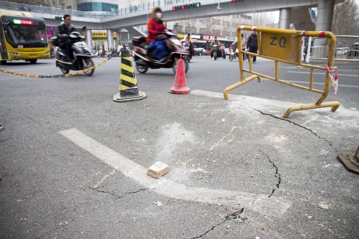 1月4日,郑州市文化路上与黄河路交叉口出现了两处塌陷,其中一处塌陷过深,几处裂缝明显,劳动人员已经用围挡围起来警示过往车辆。该塌陷处位于由南向北车道的中央,车辆行人纷纷绕行。