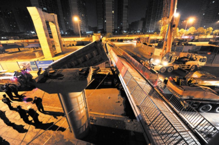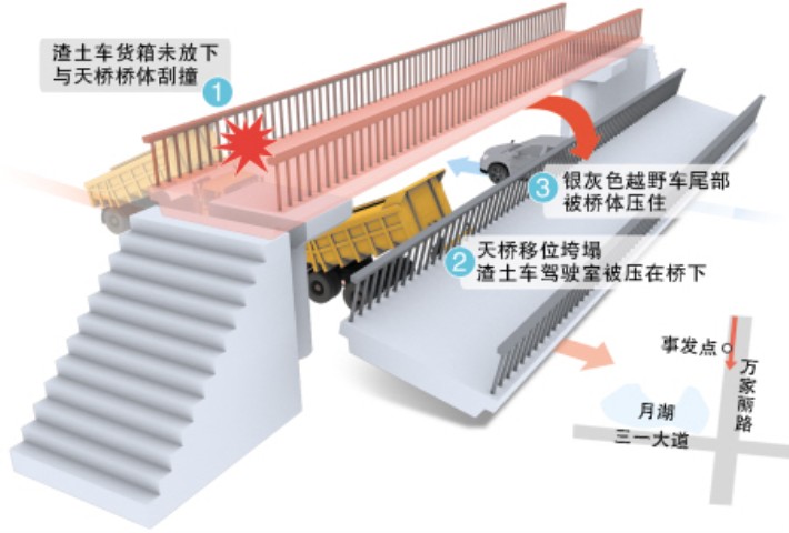 12月18日17晚10时30分左右,湖南省长沙市万家丽路月湖公园路段一处50多米长的人行天桥被渣土车撞塌,两辆车被压住。由于桥体过重,最后切割成5段才被拖走,现场处理劳动一共连续了12个小时。18日中午11时30分左右,该处恢复通车。