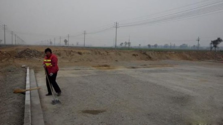 路边有麦地、在建厂房。路面推土机的车痕犹在,土很细,一脚踩下去鞋上都是灰。偶尔有汽车驶过,尾部腾起尘烟。因为掩盖不彻底,有的地方露出下水管道、水泥路面、人行道砖。