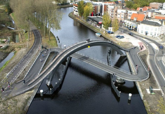 这是荷兰无障碍melkweg大桥,巨大的拱形桥联系河岸两侧道路,引人注目的耸立在水上,高达12米,形成一道壮丽的城市景观。人们在高点可以充分领略城市的新旧风貌。