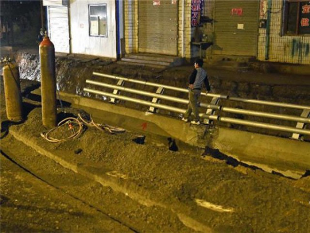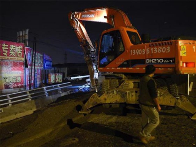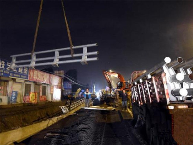 14日晚,太原市太榆路一处高架桥(近蓝海汽配城)的北向南偏向下桥处产生垮塌,事发路段长约20米,未造成人员伤亡。
