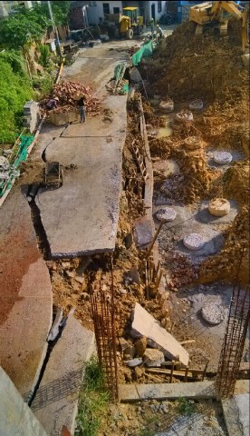 直接把道路打碎,再在上面填泥,之后再重新打一条道路,最后在基坑和道路之间,用槽钢顶住道路