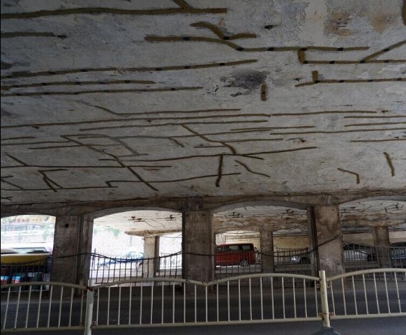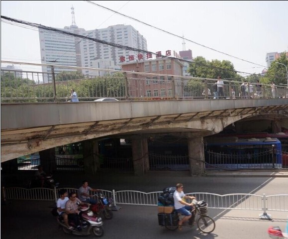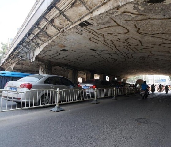 郑州市二马路跨正兴街的马路桥,因桥体存在安定隐患,贴满了碳纤维布来加固桥梁,数百条“补丁”错综纷乱的贴于桥底顶部,让人眼花缭乱。该桥连接火车站与二马路汽车站,每天都有大量汽车、行人从上面通过。