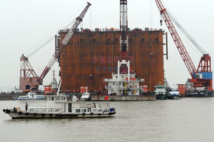 沪通长江大桥是沪通铁路的关键性控制工程,两岸连接江苏省南通市和张家港市,主桥接纳双塔斜拉桥设计,于2014年3月1日开工建设,建设工期约5年半。28号桥墩是大桥的主墩之一,底部为钢壳沉井,上部为混凝土沉井,总高105米,其中钢沉井高44米,将被永久打入江底。为方便吸泥下沉,沉井平面安排为24个12.8米×12.8米井孔。所以,从空中俯瞰,这座“巨无霸”的钢铁建筑就像一块蜂窝煤。下一步,施工方还将利用2至3个月时间,对钢沉井进行精确定位,并通过混凝土灌注,使沉井进一步“长高”,最终总高将到达105米,使这座世界第一钢沉井完全稳定。