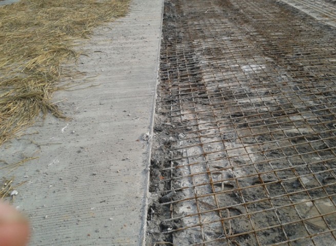 这里是已经铺装好了的1/3幅的交界处。可以看到在轨道钢筋下方有不少混凝土浮浆(两边都是如此,另一边是用的沙子作为模板,但是沙子被挤压冲散,有不少浮浆溢出),这和混凝土配比有关系吗?还有这些浮浆是不是要处理掉?