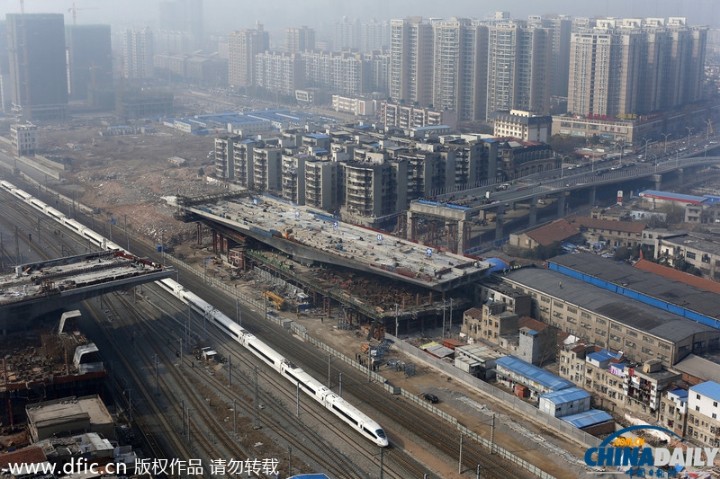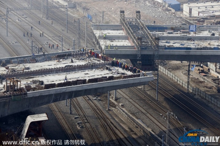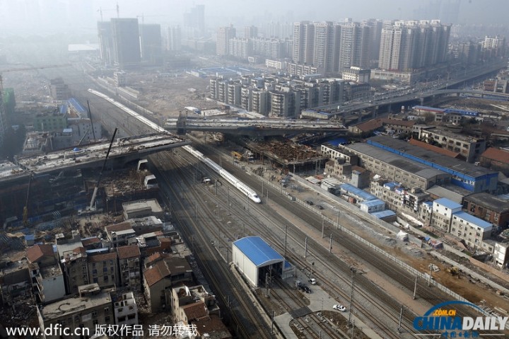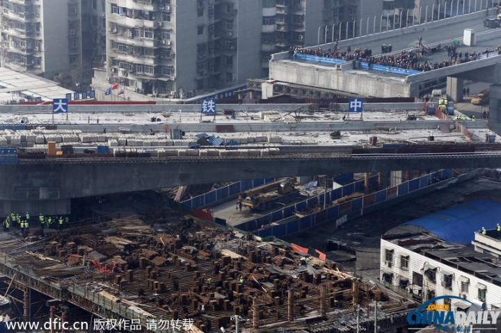 2014年1月14日,武汉,姑嫂树公跨铁立交桥将进行箱梁转体,跨越京广、合武等铁路线。为减少对铁路的滋扰,该桥接纳转体法施工,即桥梁先在顺铁路偏向浇筑,浇筑完成后,再通过转体装置转体,横跨铁路。转体将在离地面15米高处进行,是我国首例高空转体施工,难度极大。