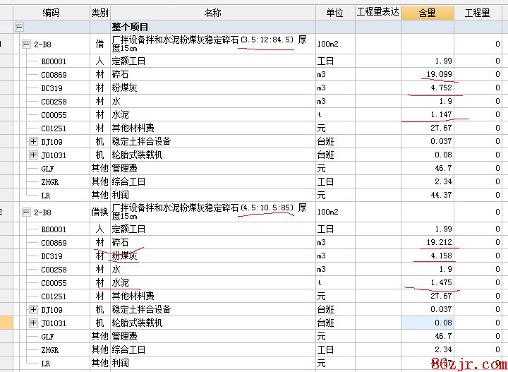 公路中水泥粉煤灰碎石和水泥生石灰碎石的换算,定额子目中是体积比,用原含量/原比例*现比例,好比市政子目换算如下