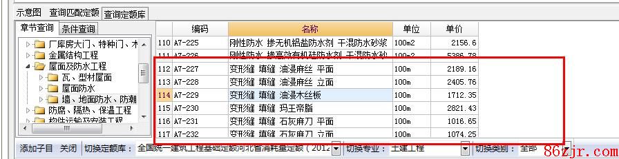 在屋面及防水工程局部章节中,楼地面变形缝,平面立面,套用对应材质的对应部位的定额子目即可,当没有对应材质时,可以套用近似的,然后换算其中的质料即可.