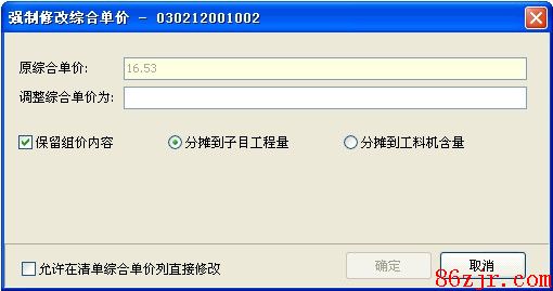 2.在“调解综合单价为”栏内输入综合单价,点击确定即可。 操纵技巧:1、如果这条清单已经输入子目进行了组价,又希望保存原组价内容,则把“保存组价内容”打勾,并选择“分摊到子目工程量”或者“分摊到工料机含量”,选择前者将把调解后的价格增减分摊到子目工程量,后者将分摊到子目下的工料机含量中,清单项下的子目全部变为换,若只是某条子目修改,直接在工料机显示上修改含量。 2、如果希望能直接输入清单综合单价,则把“允许在清单综合单价列直接修改”选中。 注:没有定额子目的清单综合单价是0,但可以通过强制修改综合单价给清简单个综合单价。 锁定综合单价 然后再去调解的