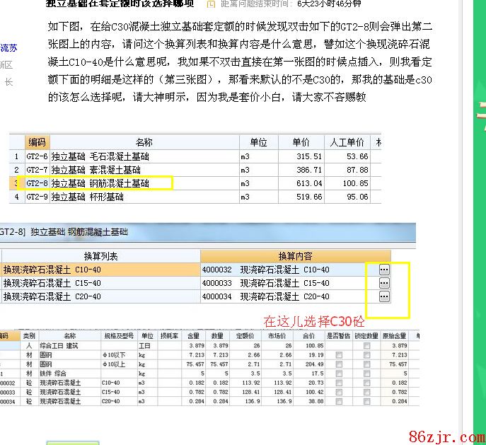 的时候发觉双击如下的GT2-8则会弹出第二张图上的内容,请问这个换算列表和换算内容是什么意思,譬如这个换现浇碎石混凝土C10-40是什么意思呢,我如果不双击直接在第一张图的时候点插入,则我看定额下面的明细是这样的(第三张图),那看来默认的不是C30的,那我的基础是c30的该怎么选择呢,请大神明示,因为我是套价小白,请大众不吝见教