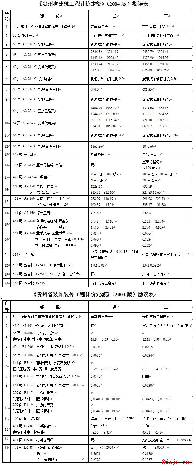 贵州04定额“2014年1期造价信息上发布的定额勘误”