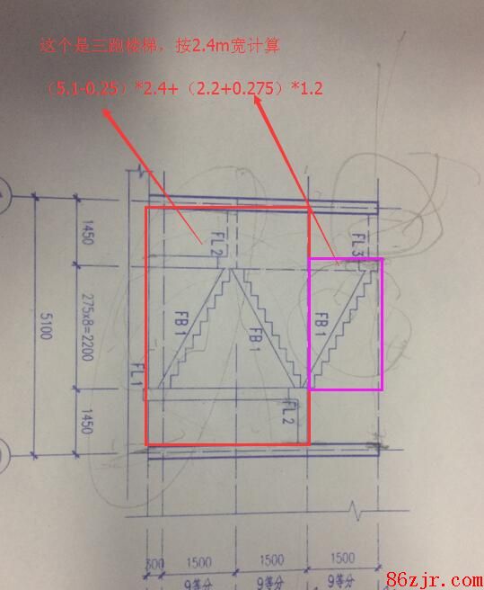 三跑楼梯按普通双跑楼梯的1.5倍计算就可,而普通双跑楼梯的水平投影面积:包括梯板、中间休息平台、宽度小于500mm的楼梯井面积、有平台梁的算至平台梁内侧,无平台梁的算至最上一级台阶向外拓展0.3m计算。如此S=(2.2+1.45-0.125+0.25)*2.4*1.5=13.59