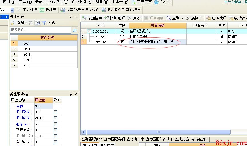 1、用“金属(塑钢)门”清单项,然后对应的套上“准则全封钢门”安置子目,制作用度“准则半玻钢门”,标注上相应的名称,图片1;