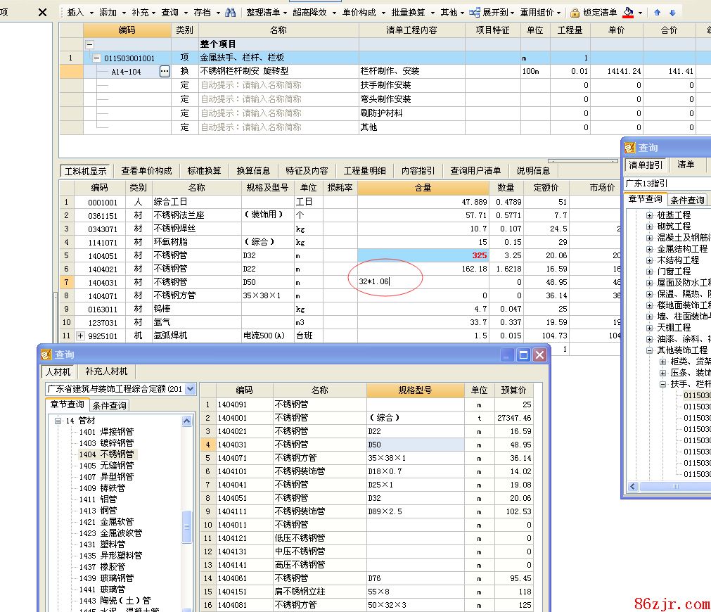 最佳答案应该说定额栏杆的质料含量是综合考虑的,因栏杆的形状也是五花八门,实际的质料用量与定额含量也会存在差别,且有时的差别不是很大的,定额也没有具体的调解或换算方法的规则,就目前市面对栏杆的计算,遇到这种情况通常的做法,是将设计管的量进行一下计算,有差别管材就分差别的计算出量,并乘上1.06(钢材的合理损耗),在套相应的定额子目的工料机中做一下调解,有超过子目范畴的管也插入后列入计算。 建筑问答网永远以提供国内外最新、最好、最快的造价专业资讯为目标 建筑问答网永远以提供国内外最新、最好、最快的造价专业资讯为目标