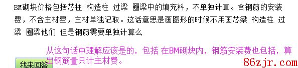 BM砌块价格包括芯柱 结构柱 过梁 圈梁中的填充料,不但独计算。含钢筋的安置费,不含主材费,主材单独记取。这话意思是画图形的时候不消画芯梁 结构柱 过梁 圈梁他们 但是钢筋需要单独计算么
