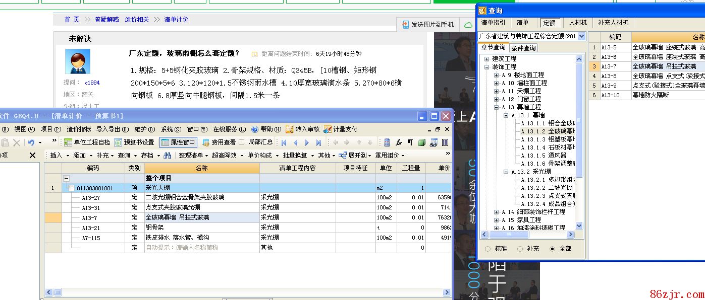 最佳答案图片供你参考,“5+5钢化夹胶玻璃”价格与定额有差别时,用价差进行调解;“骨架规格、材质:Q345B”要按设计要求计算出数量,这个数量定额子目“光棚骨架夹胶玻璃”有差别时,就要再套一个“钢骨架”的增减子目(实际数量),但需要注意要对选择的“不锈钢或铝合金骨架”的量删除;“不锈钢雨水槽”用定额的“铁皮排水 落水管、檐沟”取代,质料可以调解为不锈钢板或者用价差进行调解;“10厚宽玻璃滴水条”就按“全玻璃幕墙 悬挂式玻璃”取代;“横向钢板 6.8厚竖向牛腿钢板,间隔1.5米一条”数量并入“钢骨架”。 建筑问答网永远以提供国内外最新、最好、最快的造价专业资讯为目标
