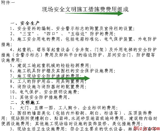 安全施工费:包括“四口”(楼梯口、电梯口、通道口、预留口)的封闭,防护栏杆,高处作业悬挂安全带悬索或其他设施,施工机具安全防护而设置防护棚、防护门(栏杆),起重机、塔吊等起重设备(含井架、门架)及外用电梯的安全防护