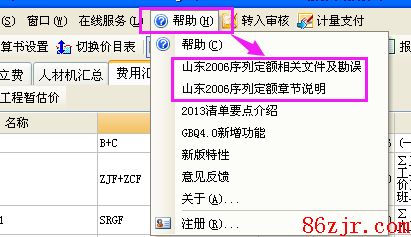 在计价软件的输入界面东西栏——“援助”中,均有定额的章节说明、工程量计算规则和综合解释等帮助东西文件;