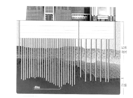 这里我来摆摆数据,台北101主楼的基础板下面有380根直径为1.5m的群桩,平均进入岩层的深度为23.3m;裙楼下面一共有167根直径为2m的桩,平均进入岩层的深度为15.5m。这里我们仅讨论的是进入岩层的深度,其实在岩层上面,还有30-40m的软弱土层,再加上22m左右的开挖深度,也就是说桩的最深处可达地下80m左右。可如图2所示,密密麻麻全是桩。 这里我还要提一句,台北101下面的基础还算是相对理想的,因为有可靠的岩层存在,大众有兴趣可以去查找一下上海的几个超高层建筑,桩深和桩的直径都要比台北101的大,因为上海的软土地质。