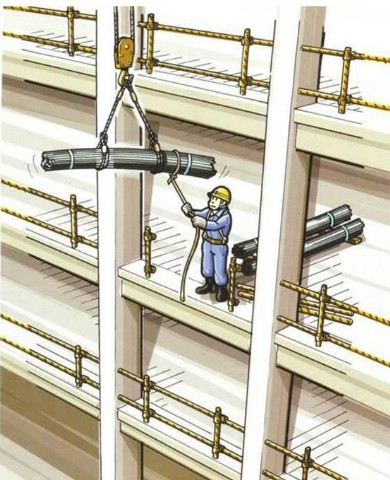 正在上方平台上下放钢筋质料。