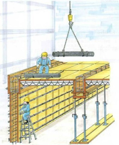 正在进行立模作业的上方同时在进行钢材的下放作业。