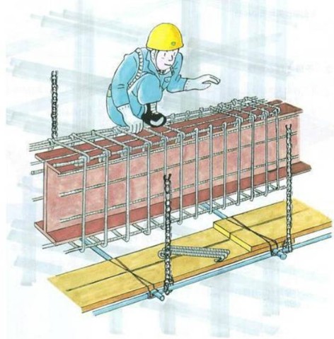 来回跨过钢梁拿钢筋零件。